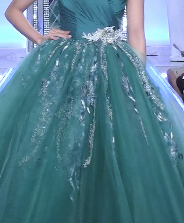 トレンドのグリーンカラーが目をひく、カクテルドレスです。幾重にも重なり合ったチュールのスカートが、独特の雰囲気ボリューム感と軽やかさを感じさせ、サッシュベルトにハンドメイドの繊細なビジューも、花嫁様に是非ともおススメしていただきたいデザインポイントです。