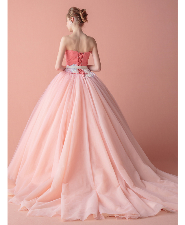 華やかなボリュームのあるチュールスカートに大人っぽさをプラスした絶妙な甘さのカラードレス。スカートラインの刺繍の配置は縦のラインを強調し、ネックラインは細いプリーツのハートカットでスッキリ感を表現。ウエストのビジューはドレス全体を引き締めています。