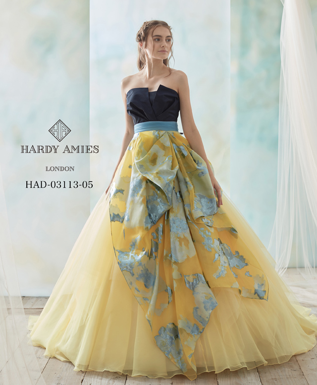 『真実の愛』が花言葉のマーガレット柄のフラワーレースのウェディングドレス。ラインは普遍的なミカドの王道Aラインスタイルを採用しました。クラシックな中にもひときわ目を引くのはマーガレットの存在感。途中からカットワークで透け感のあるレーススカートに表情を変えて柔らかさと軽やかさを表現しました。シルバーゴールドの刺繍糸で花弁と花びらのメリハリを付けて、透明のスパンコールの煌めきが華やかに輝きます。ふんわりバルーンのお袖をつけた個性的なお洒落感や、オフショルダーヨークだけのクラシカルな印象等、アレンジを楽しんで頂けるよう取り外し仕様にしました。バックスタイルはマーガレットが咲き誇るインパクトのあるロングトレーンで忘れられない後ろ姿を演出しています。